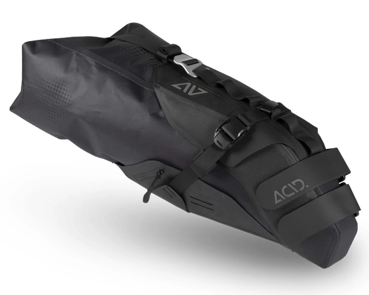 Vom Micro-Adventure bis zur längeren Bikepacking-Tour: Das Acid PACK PRO 15 wurde mit erfahrenen Bikepackern entwickelt. Das zweiteilige System aus Harness und wasserdichter, verschweißter Drybag ist funktionell konzipiert. Dank des flexiblen MOLLE-Systems lässt sich der Harness sicher an Rail und Sattelstütze anbringen und kann auch am Rad verbleiben. Die robuste Dry Bag wird in den Harness gesteckt, fixiert und ist abends oder zwischendurch schnell wieder entnommen. Ein weiteres Feature: Der Tascheninhalt lässt sich durch ein integriertes Entlüftungsventil noch weiter komprimieren. Reflektierende Elemente an beiden Teilen erhöhen die Sichtbarkeit im Straßenverkehr. Auch ein Rücklicht lässt sich problemlos integrieren.