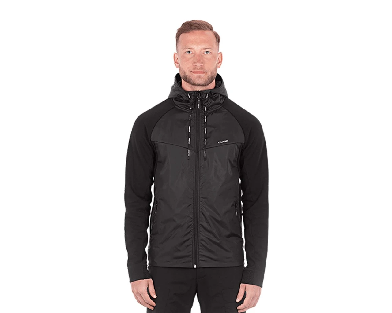 Features: Baumwollmix; partieller Windschutz; seitliche Eingriffstaschen mit Reißverschluss; verstellbare Kapuze; sportliche Passform; durchgehender Frontreißverschluss; elastischer Saum; Logo-Druck