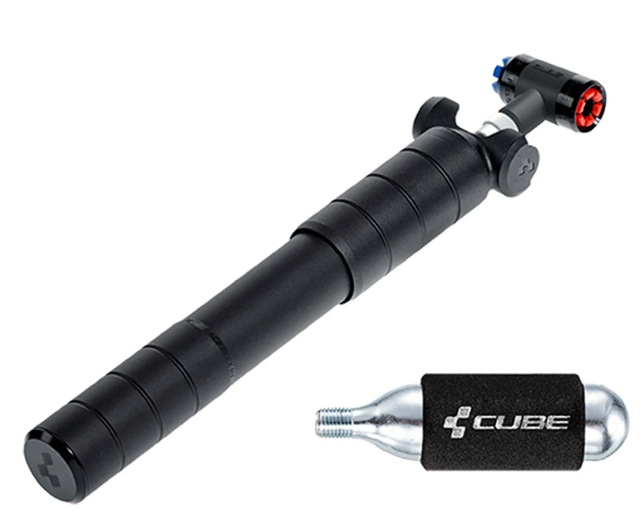 Features: CNC-gedrehte Aluminium-Hybrid-Pumpe mit viel Volumen, Kombination aus Minipumpe und CO2- Kartuschenpumpe, EZ-Head für Presta- und Schrader-Ventile, herausziehbarer Schlauch, Griffverriegelung, inklusive Halterung und 16g CO2-Kartusche, 80 psi max.