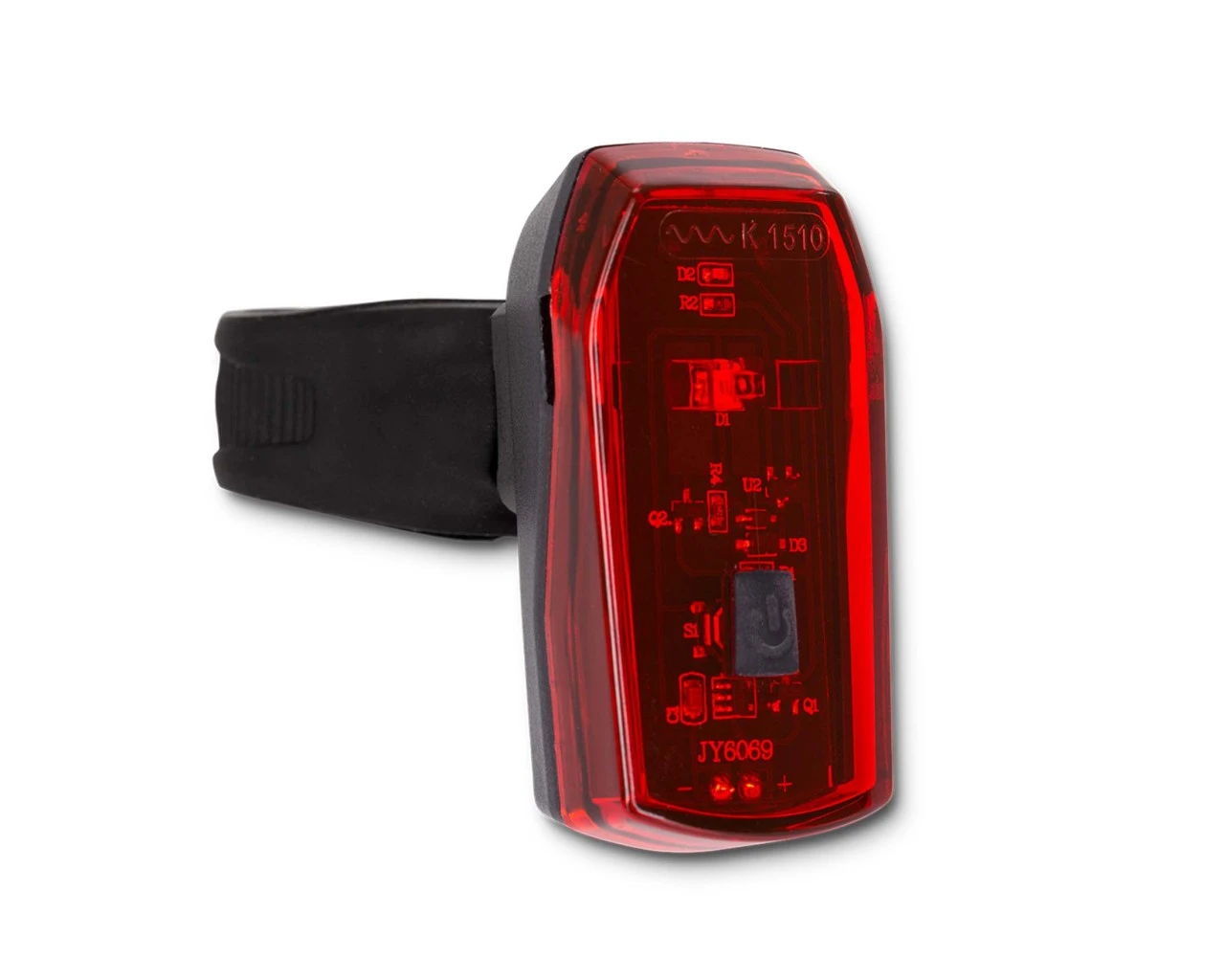 LED-Rücklicht; StVZO zugelassen; zwei AAA-Batterien; Batterieindikator; spritzwassergeschützt; Silikonbandbefestigung
