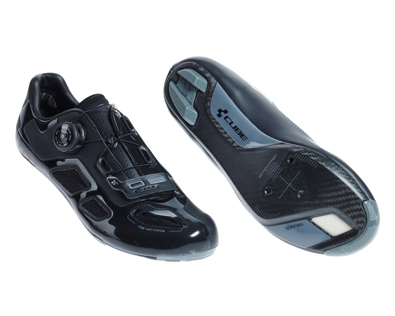Features: CUBE Natural Fit Leisten, Drehverschluss, Strap mit CUBE Wing, CUBE Vent System, Natural Fit Innensohle, große Belüftungsöffnungen, supersteife Carbon-Sohle mit Belüftungsöffnung und austauschbaren TPU-Stollen, CUBE Anti Slip System, asymmetrisches Design