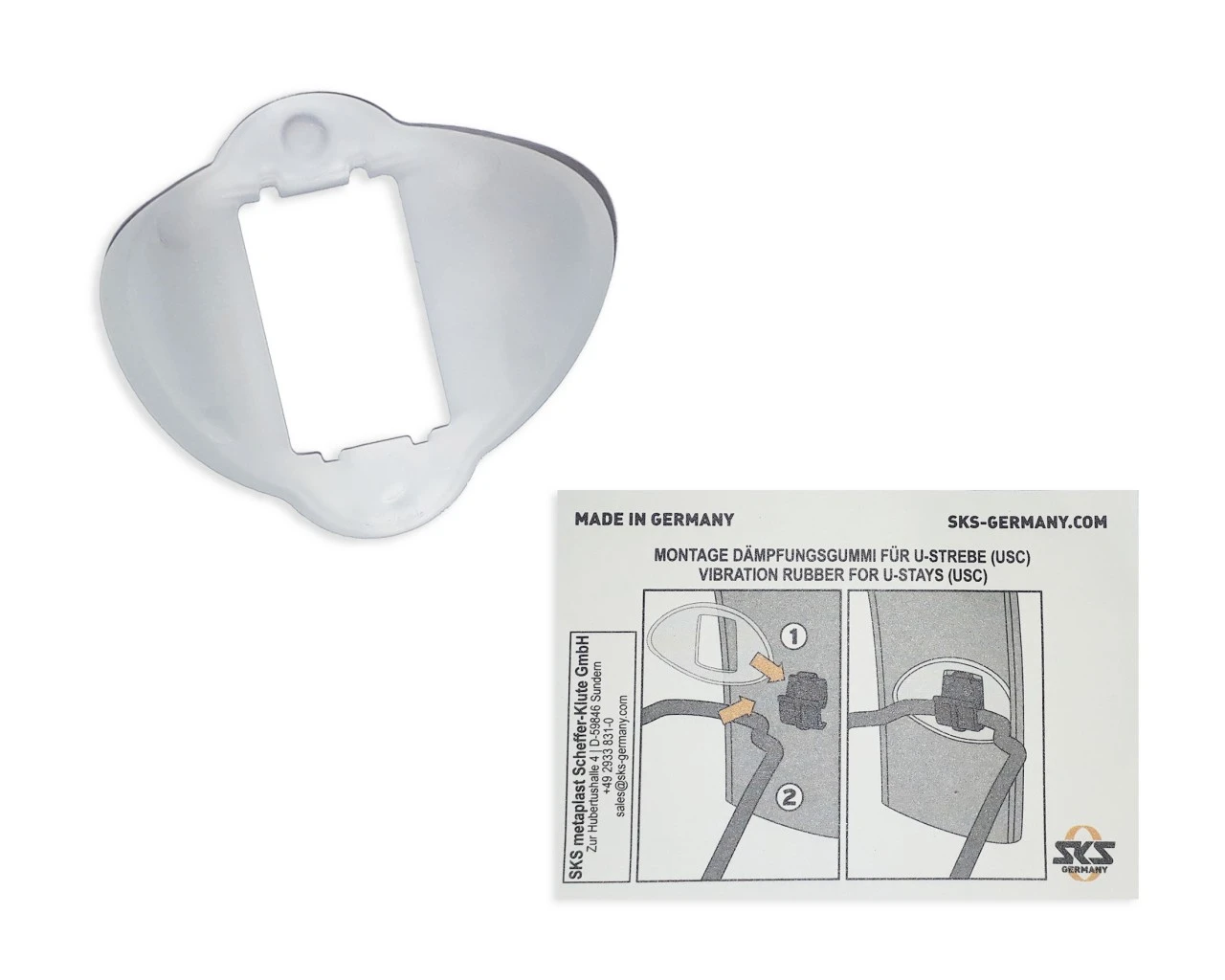 Der Dämpfungsgummi sorgt für eine klapperfreie Verbindung zwischen Unterlaufstrebenclip (11177), Schutzblechstrebe und Schutzblech. SKS gewährt auf Produkte eine Qualitätsgarantie für die Dauer von 5 Jahren ab Kaufdatum (gilt nicht für Verschleißteile) und garantiert die Verfügbarkeit von Ersatz- und Verschleißteilen.